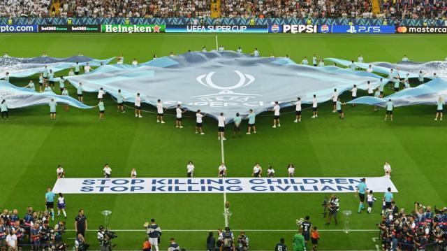 欧洲超级杯赛前,九名难民儿童踏上绿茵,呼应足下的巨幅标语:“停止杀害儿童,停止杀害平民。”策划该倡议的欧足联坚称此举并无任何政治意涵,“而是关乎人道主义,事实上,你也可以将此视为常识”。