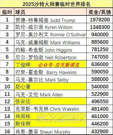 以下是目前前16的临时排名(已含沙特大师赛决赛20万英镑奖金):